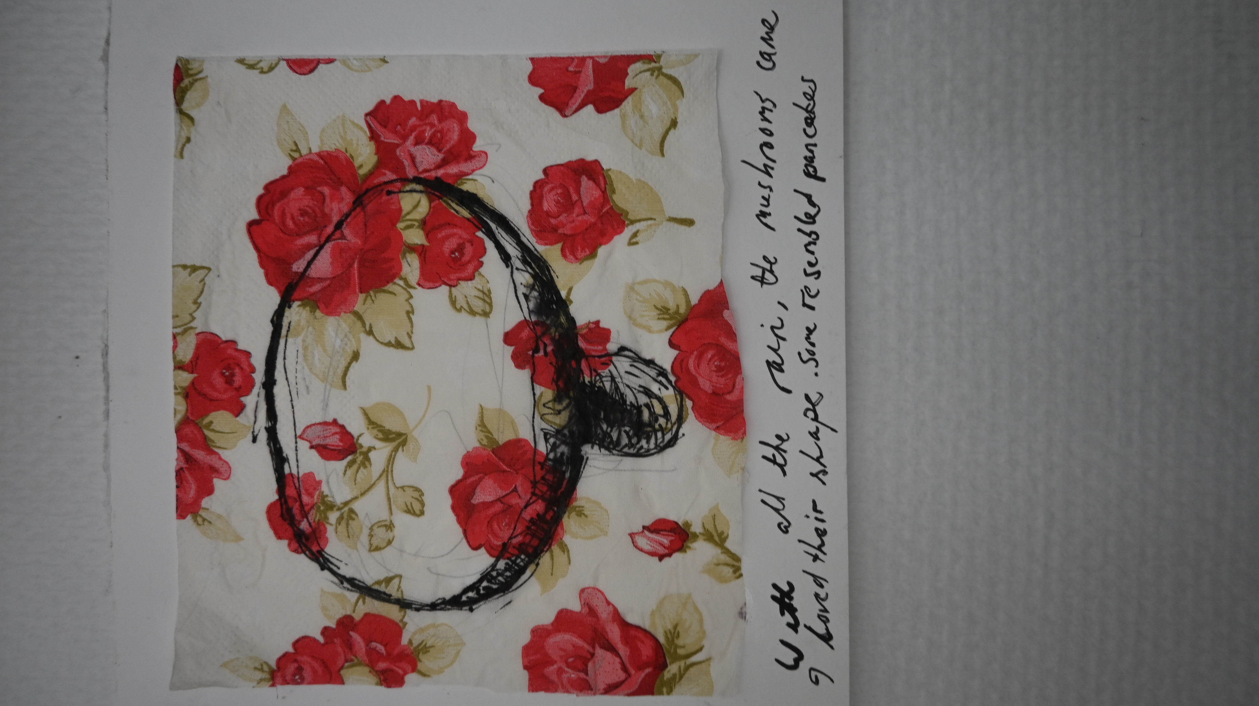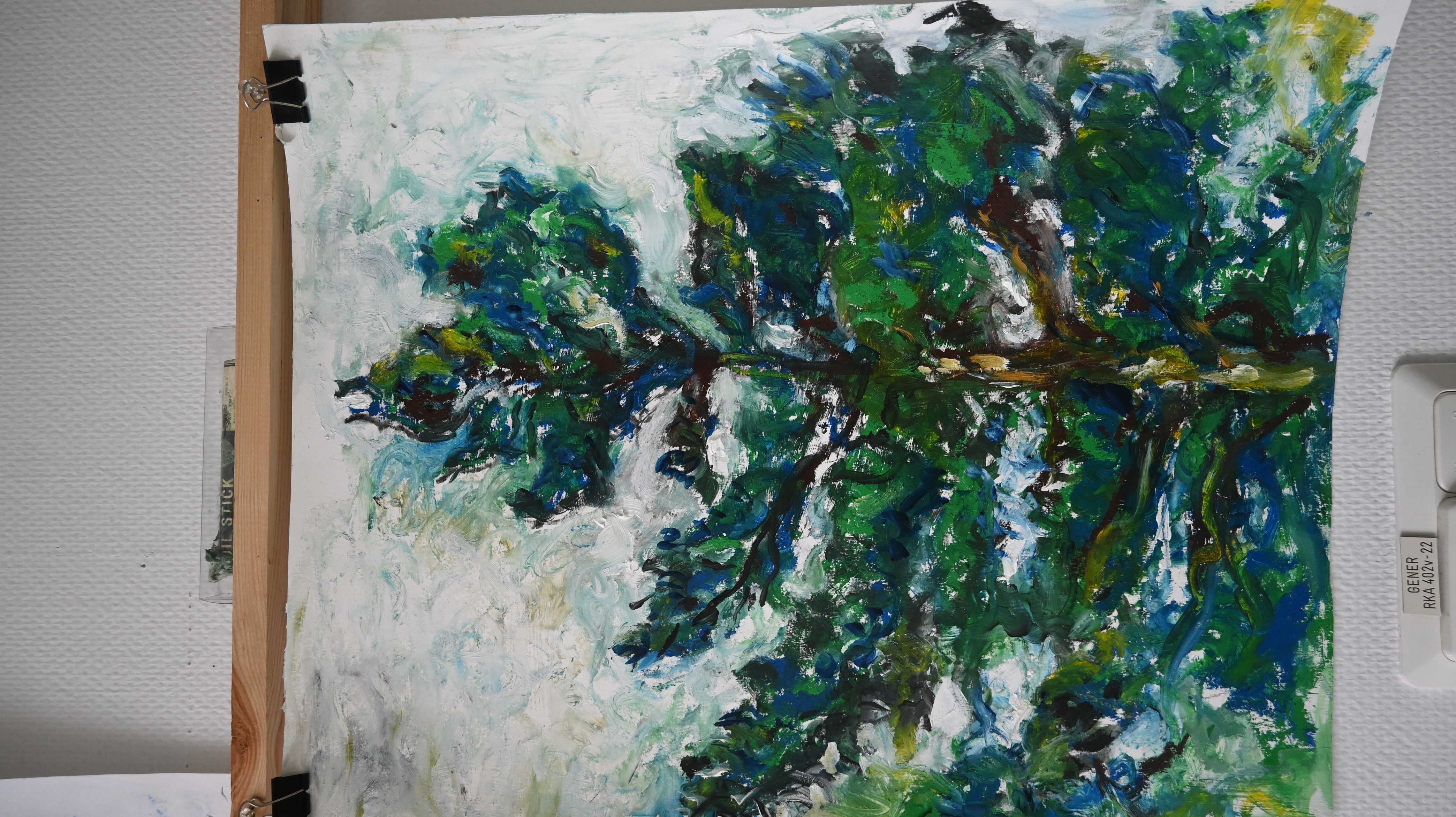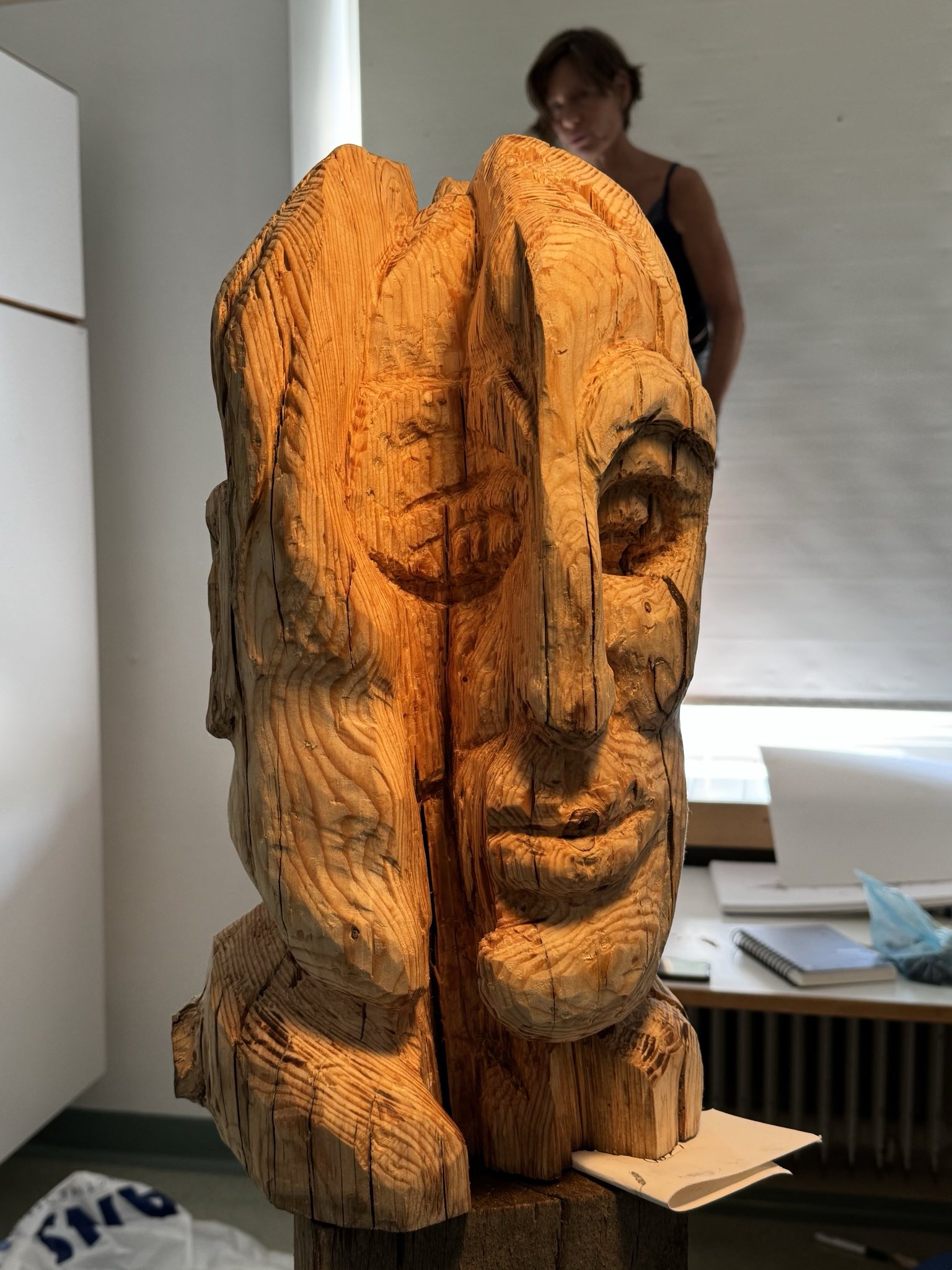 I started playing with my newly acquired paint sticks. I painted me, unsure of what was to evolve, nervous. I moved on to tree tops from my studio, to trees, to log piles to huts, and found that every day, there was something else I needed to draw or paint, or taste. Mushrooms sprung up everywhere from the eratic rainfalls and birds sung in unusual tones or hammered away at the trees high up. I was inspired. How could I not be? Then of course, I discovered wood and set out willfully to carve a rotten log. It now sits as the head of an unfinished totem pole on my kitchen table in Madrid.